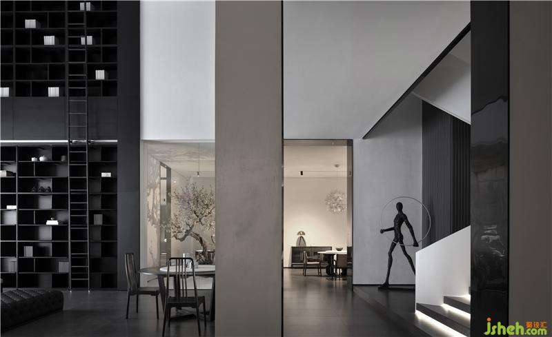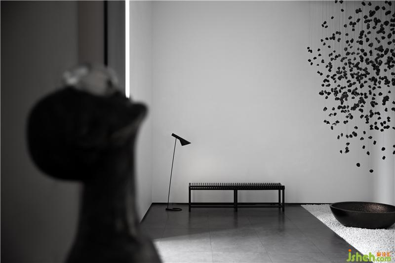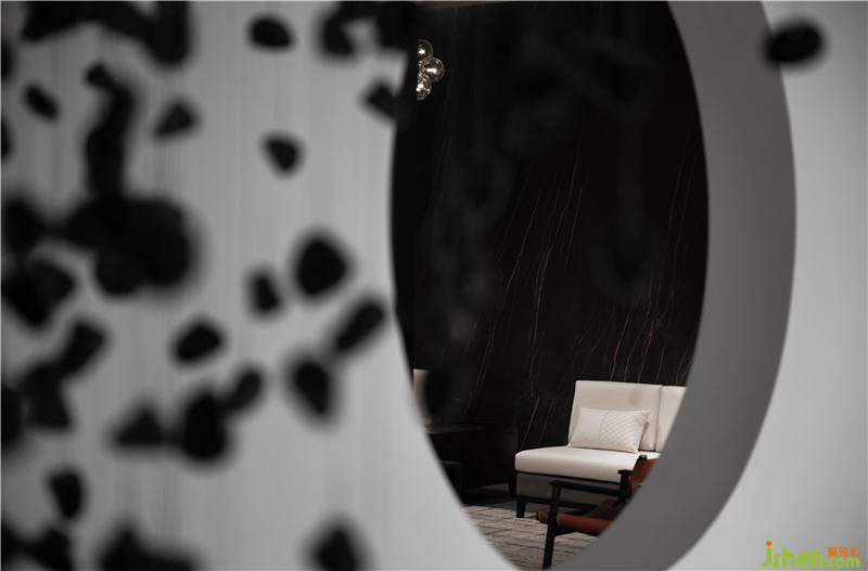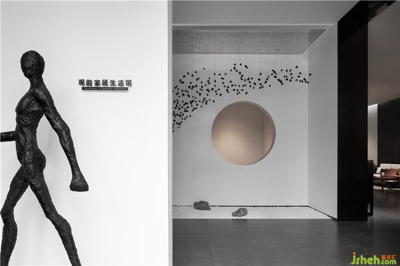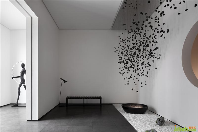 从前厅进入玄关,造景与造境,无数黑色石子从天而降,回归于一圆盘,寓意“万物归一”,顺着动线的引导,进入产品体验空间后,体验者藉由移动、视野、猜想,与空间产生互动能量。重新以美学的展现存在于空间序列之中,构建起纯粹且顺应建筑优势的室内空间逻辑。
