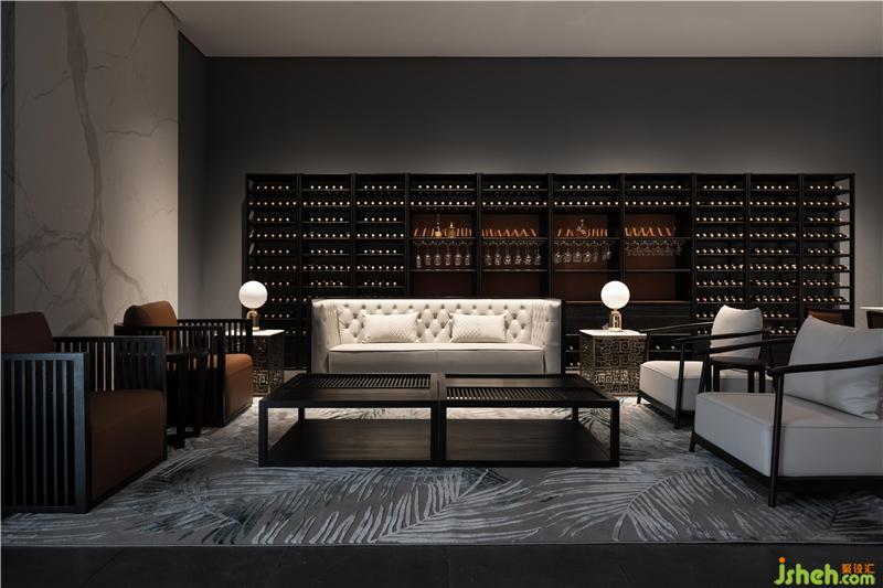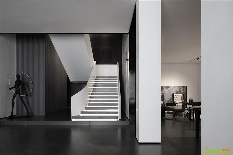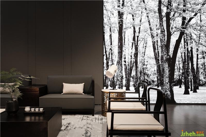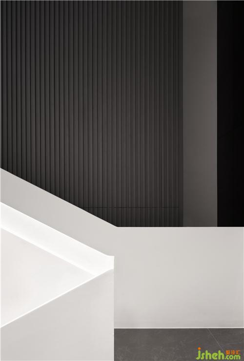 利用网格元素墙隔出相邻的功能区间,调节漫游动线的心境,另外空间一面黑白林间雪景灯箱画呈现,在空间中不同温度的感受,保证了简约空间的视觉一致性。