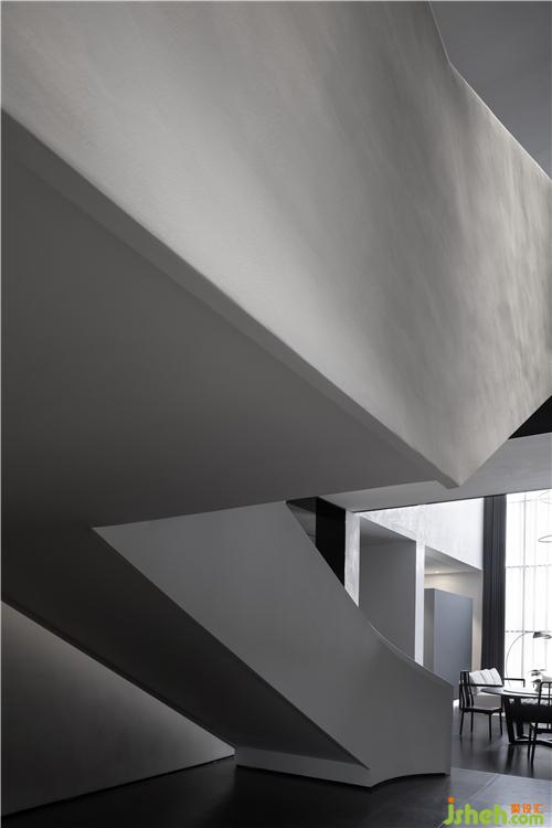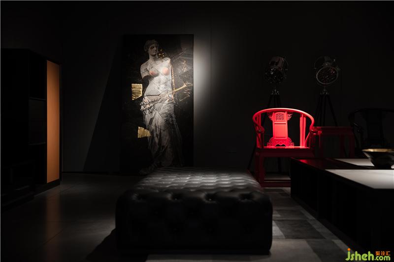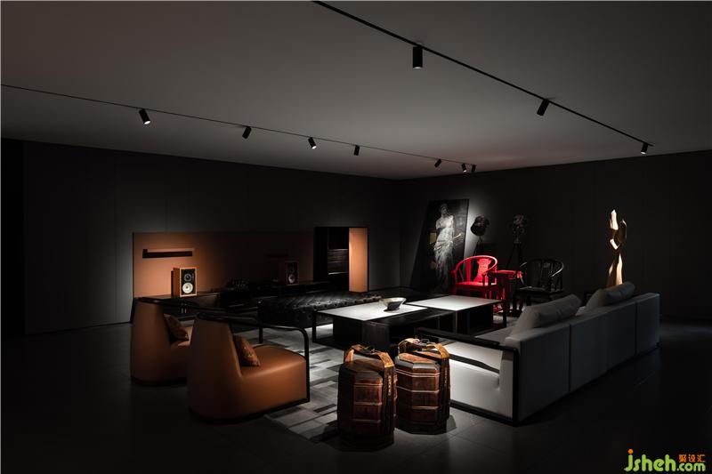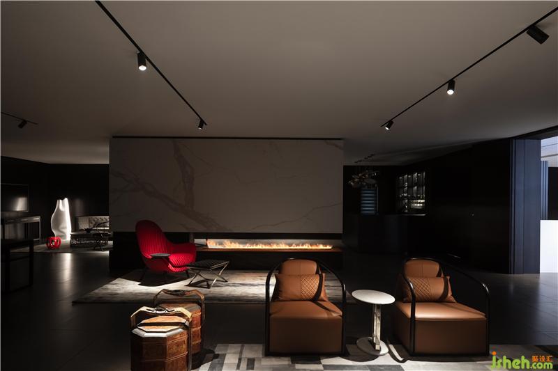 二楼是以接待会所功能定位,产品和使用功能融合一体。体验者不知不觉融情于此,高调性的现代雾化壁炉,红色惊艳的中式圈椅,有上百年历史的喜盒柜,还有艺术木雕衣架,所有物件混搭其中,新与旧,东与西,打断时间自然的思绪,构建丰富跳跃的视觉层次。多元素的混搭,对于这个新与旧,精致与粗朴共生的城市,是贴切的,也是应该存在的。让它和外界能够很好地链接、交融,是不经意就会进入这个空间的的理由。