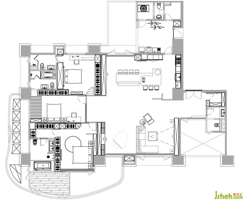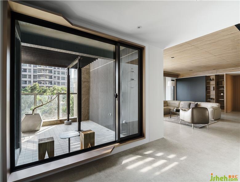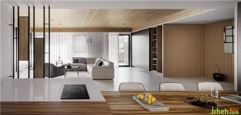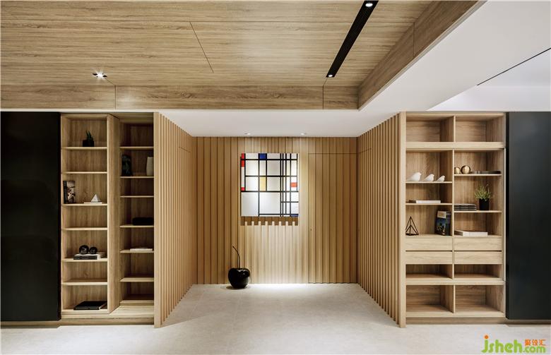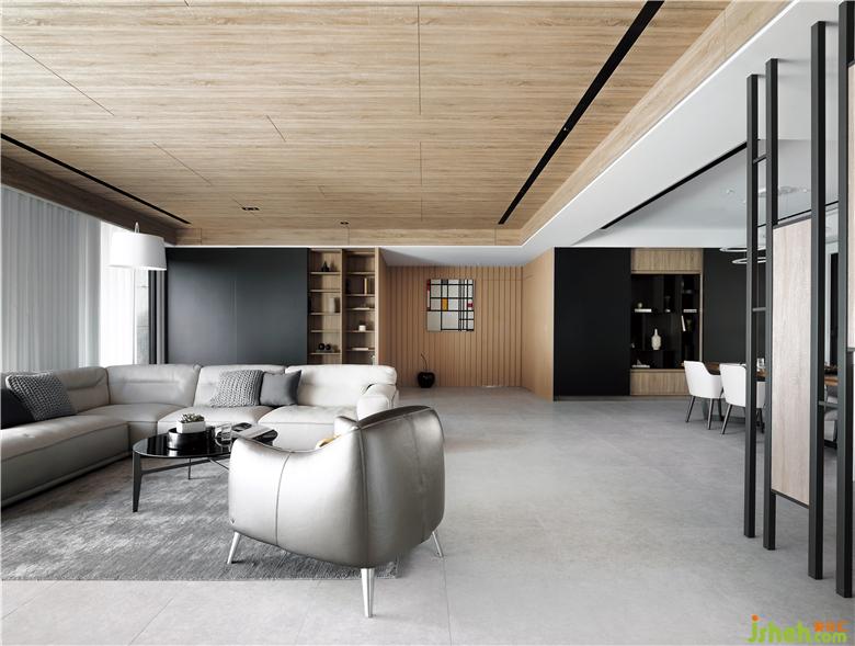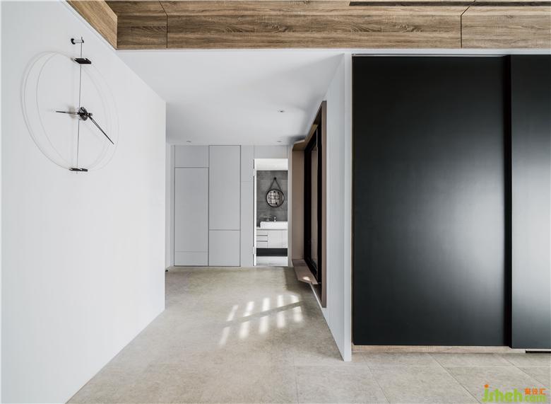 在空間中,線的單一、陣列、延伸組構成面,輔以家飾的圓,線性中融入了非線性,方中有圓、圓中有方,亦是生活中理性與感性的結合。經由構圖和色彩單純的形式,體現秩序現象與均衡之美,藝術增加了空間的質感,並導入智能式生活,打造一個智慧居家及自然舒適的環境。現代住宅的空間的分佈,提出以二元相對的思維概念,分為開放領域及私人領域,客廳、餐廳、廚房、皆視為開放空間的一環,是家人、朋友談天、用餐、聯絡情感交誼的場地。而個私人空間不對外開放,僅提供給個人獨處、聽音樂、閱讀、睡眠的隱密性空間,和開放性空間是相對的。公領域裡,區域之間不再界定鮮明,打破以往的劃分,以單一環境增進使用者在空間中無拘束感,使用上更富彈性,讓空間可容納更多的親人、朋友到訪,有更開闊的體驗。客廳無設置電視牆,採以投影布幕隱藏於天花內輕量化空間,前後端書櫃,複層櫃體平行且可以推拉,靈活使用機能善用空間。外覆可移動靛黑色面層,打開及閉合各有不同面貌,讓展示、置物、美觀、實用的機能兼具。另外將智慧管理系統植入住家環境,放置感應器及WIFI於天花板上,從大門門禁聲紋辨識,進入空間燈光感知,外出門窗防盜警示,窗簾、空調、燈光開啟及關閉,廚房火警感測,智慧家電的控制,運用IOT科技以手機載具控制或得知訊息,亦可以導入AI來獲得更多的輔助,這是人類即將開啟的生活模式。装修设计