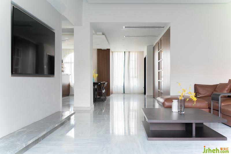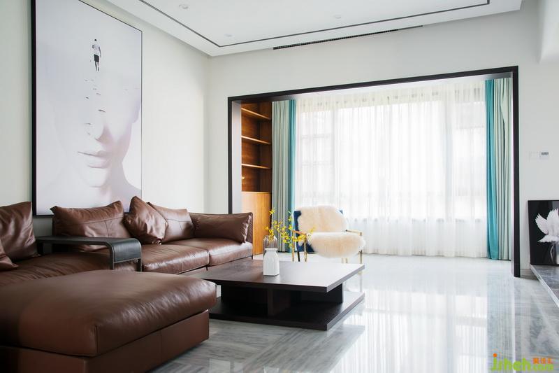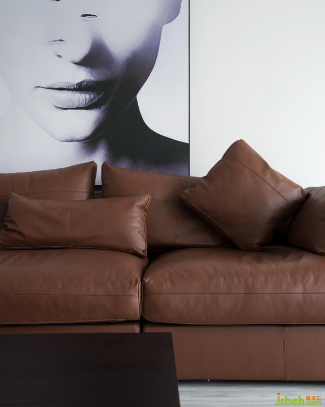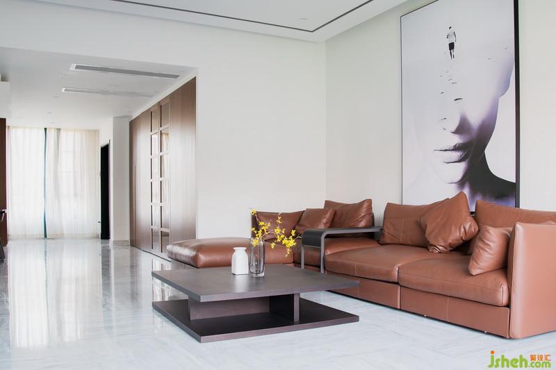 客厅整体设计干净简洁,以咖啡色的真皮沙发作为整体造型和主要色彩,搭配赋有磨砂质感的方型茶几。软度和硬度的结合让整体空间的层次感显得十分完美。墙面背景以白色为主,搭配巨幅黑白画像让整个空间显得干净有质感。室内设计师
