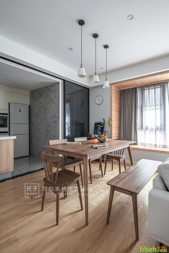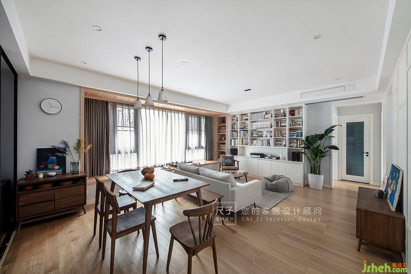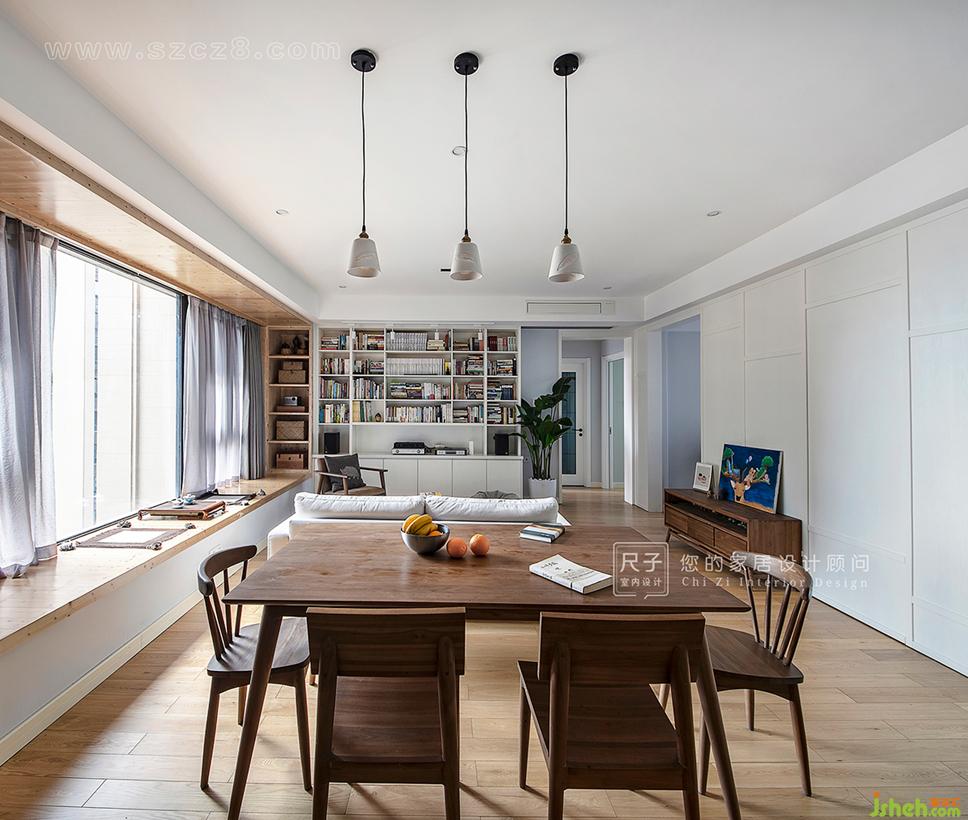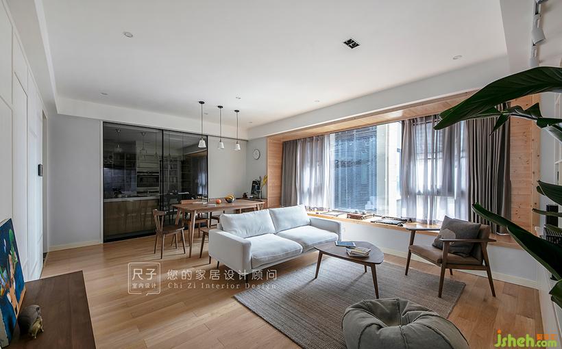 由玄关步入,客餐空间一览无余,抛弃了传统的电视布局;长长的飘窗,占据着家中最显眼的位置,与一旁的书架墙构成了这个家的核心区域。设计公司