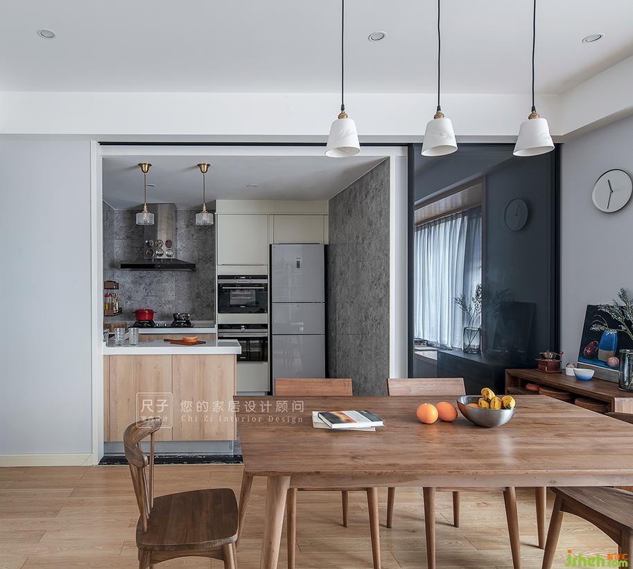 业主Y先生喜爱下厨,当然更喜欢在厨房忙碌之余能看到妻子与小孩玩乐的身影;Y先生烹饪好的美食,便通过U形厨房的吧台以及玻璃推拉门完成了“交接仪式”。