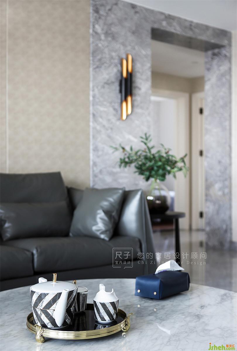 电视背景墙饰以纯天然的大理石,细节处做了叠级的变化,与硬包沙发背景相呼应,空间有了丰富的层次变化。