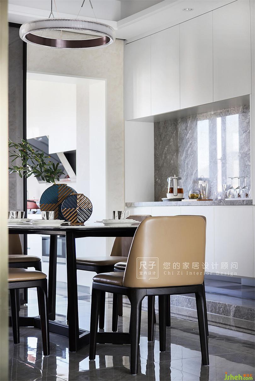 餐厅背景与沙发背景墙采用同色的硬包,让空间视觉连贯的同时又更加柔和。