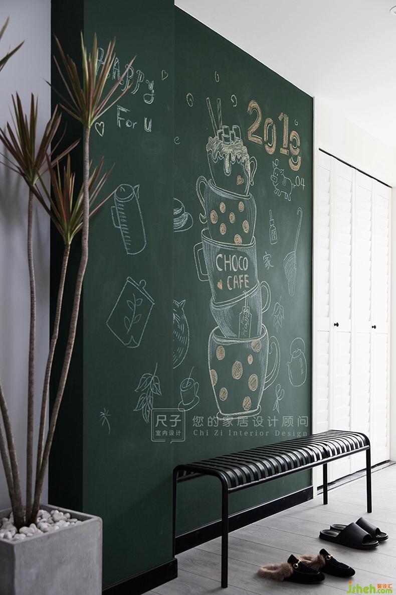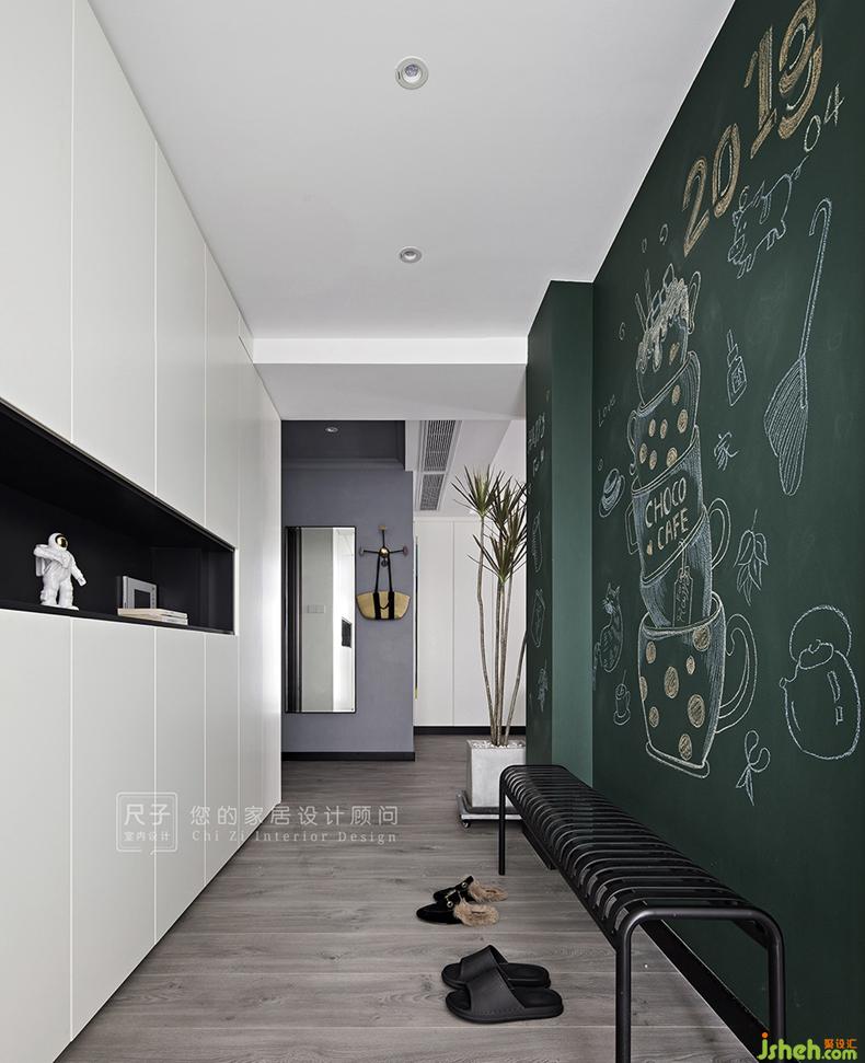 玄关空间是实用与艺术的交界地,到顶的玄关柜承载着这个家的收纳重任;右侧的黑板墙则是用来记录一家人温馨的点滴。深圳设计公司
