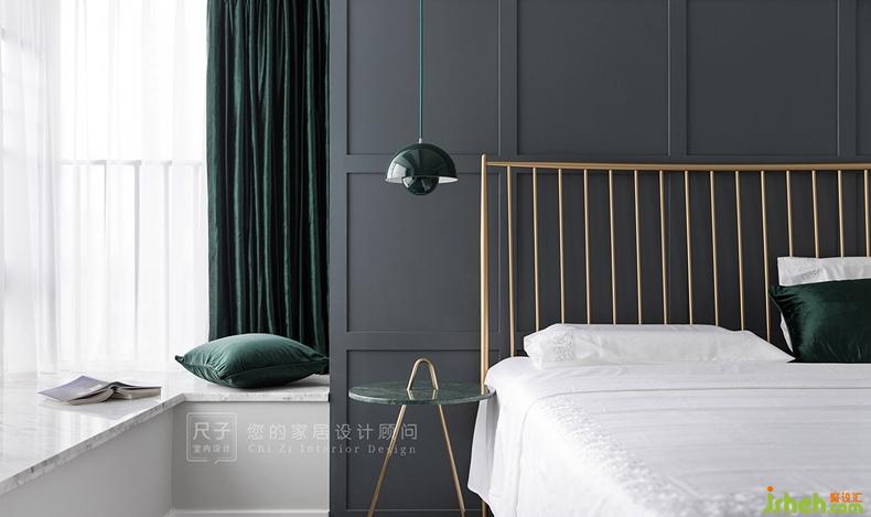 主卧背景墙延续着客厅的基调,时尚的墨绿软装与黄铜色的铁艺床头,给空间带来复古高贵的气质。深圳设计公司