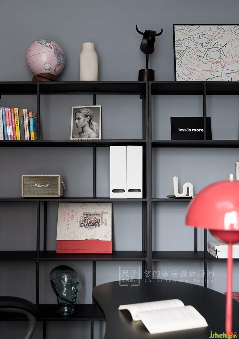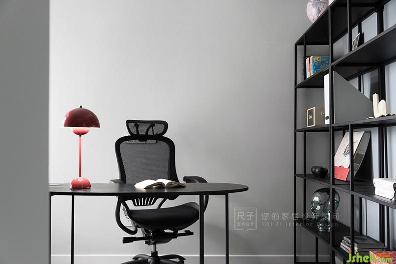 书房家具以工业风为主,简约而有质感;淡珊瑚色台灯让原本严肃的工作环境瞬间变得柔软。