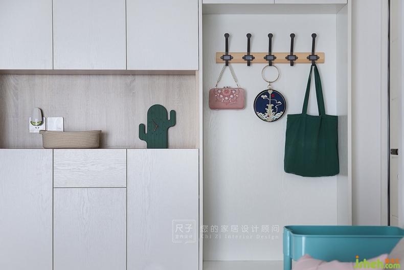 设计的一大作用便是为生活提供便利。到顶的玄关柜一侧做换鞋凳,进门后,顺手挂上包包、换鞋,动线流畅;底部空隙还可以放置当季常穿的鞋子。