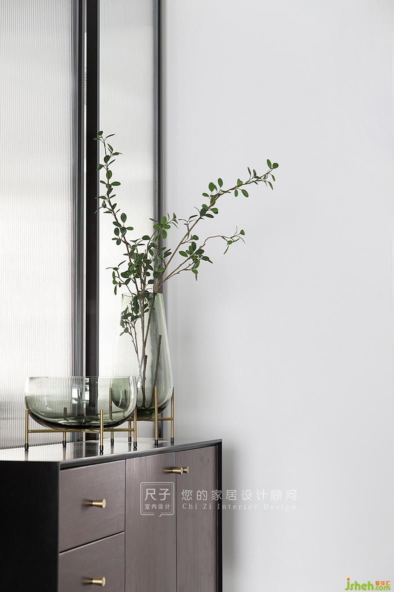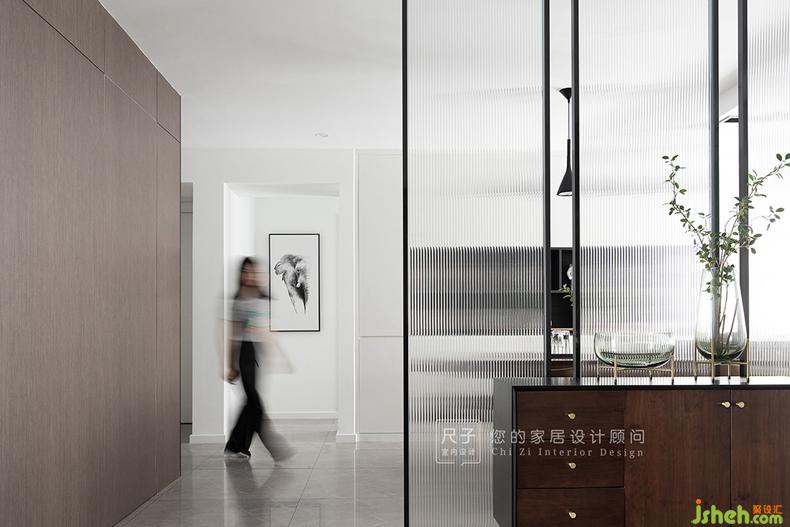 长虹玻璃与胡桃木色矮柜构成这个家的入户端景。深圳设计公司