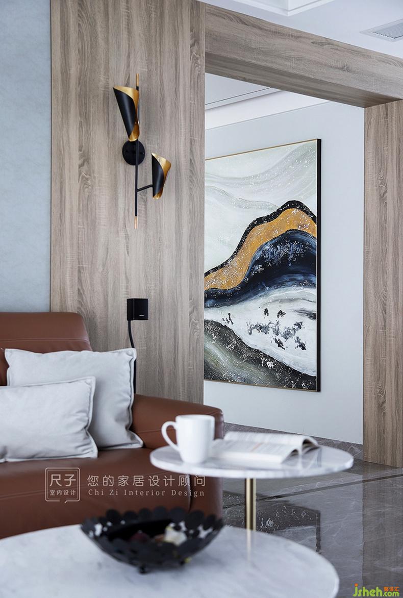 木质门框向左延伸与沙发背景呈现自然的过渡,简约的吊顶设计,天花不锈钢线条围边让空间更为挺拔;空间不单调,氛围精致明暖。