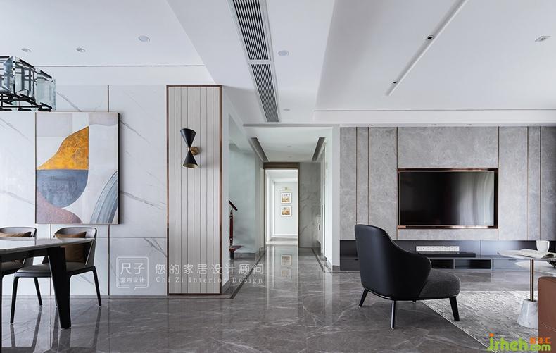 香槟金线条将灰色石材电视背景墙分割为对称格局,纵向纹路也与餐厅一侧的硬包背景有了联动。深圳设计公司