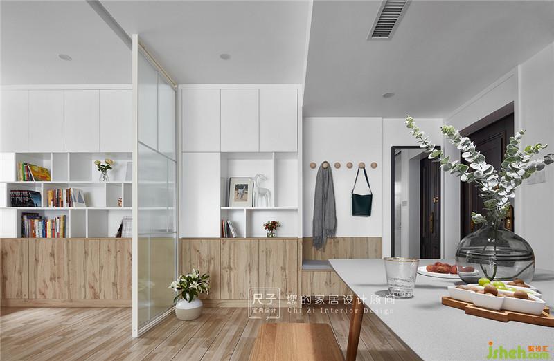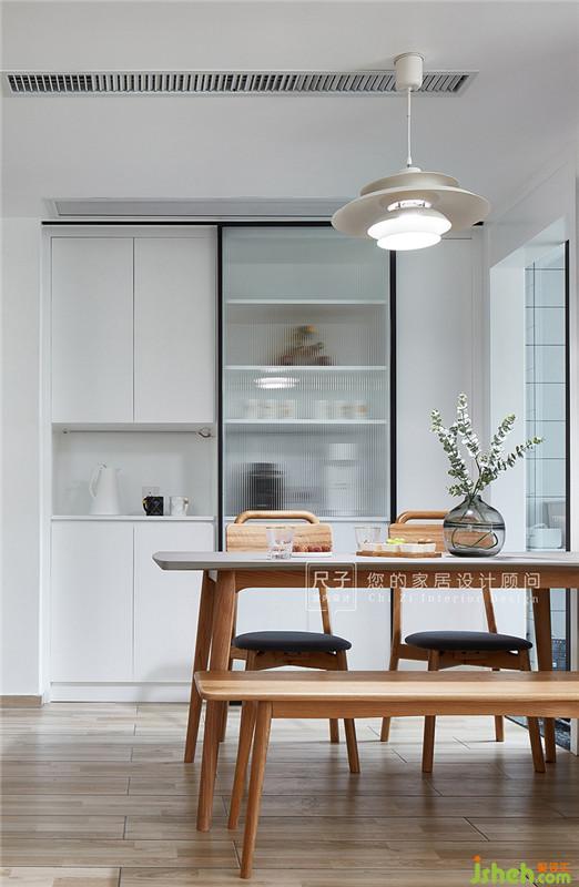 进门左侧就是这个家的餐厅区域,清雅的浅木色餐桌椅营造温馨的用餐氛围;餐边柜长虹玻璃移门给简单的场景带来朦胧变化的美感。