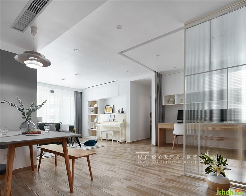 由于工作原因,夫妻二人免不了需要在家办公,D小姐希望能有一间书房。我们以拉帘+长虹玻璃半隔断进行巧妙的功能分区,打造客餐厅、书房一体的开放式格局。室内设计师