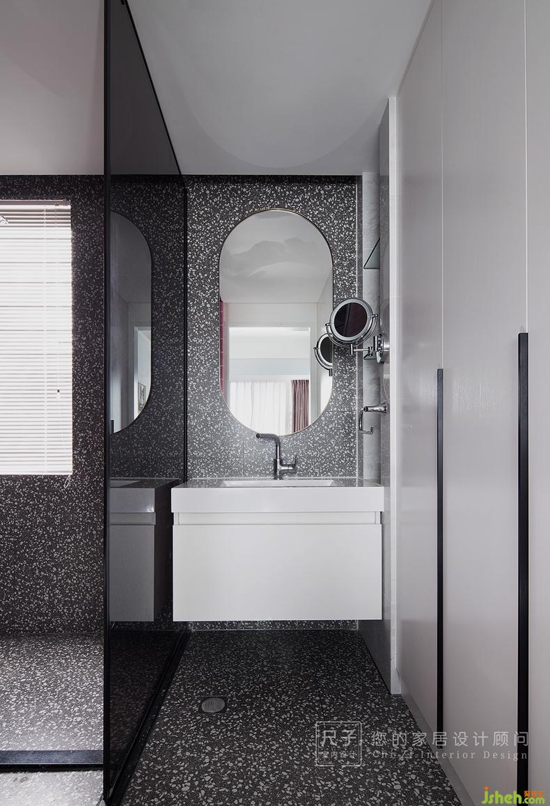 私密的主卫空间,有粉红小方砖与水磨石的大胆碰撞,也有灰玻与百叶窗对光影的诠释。