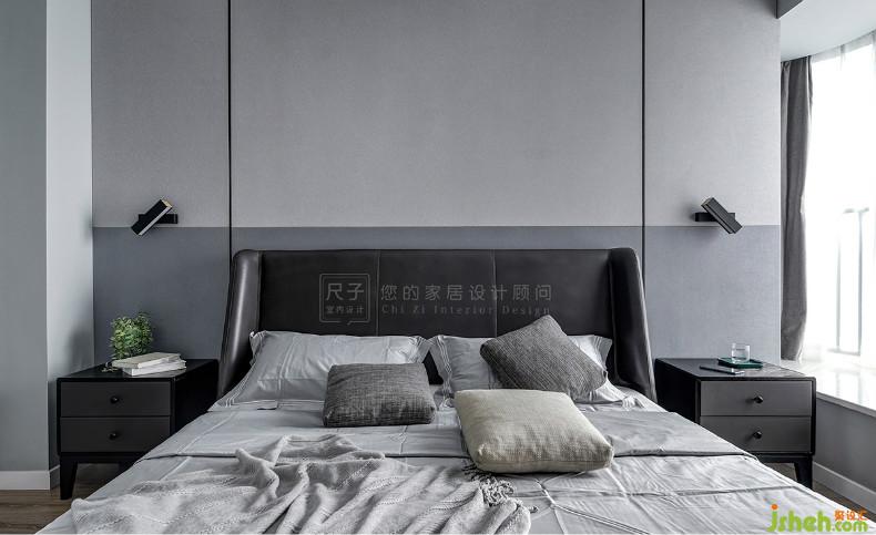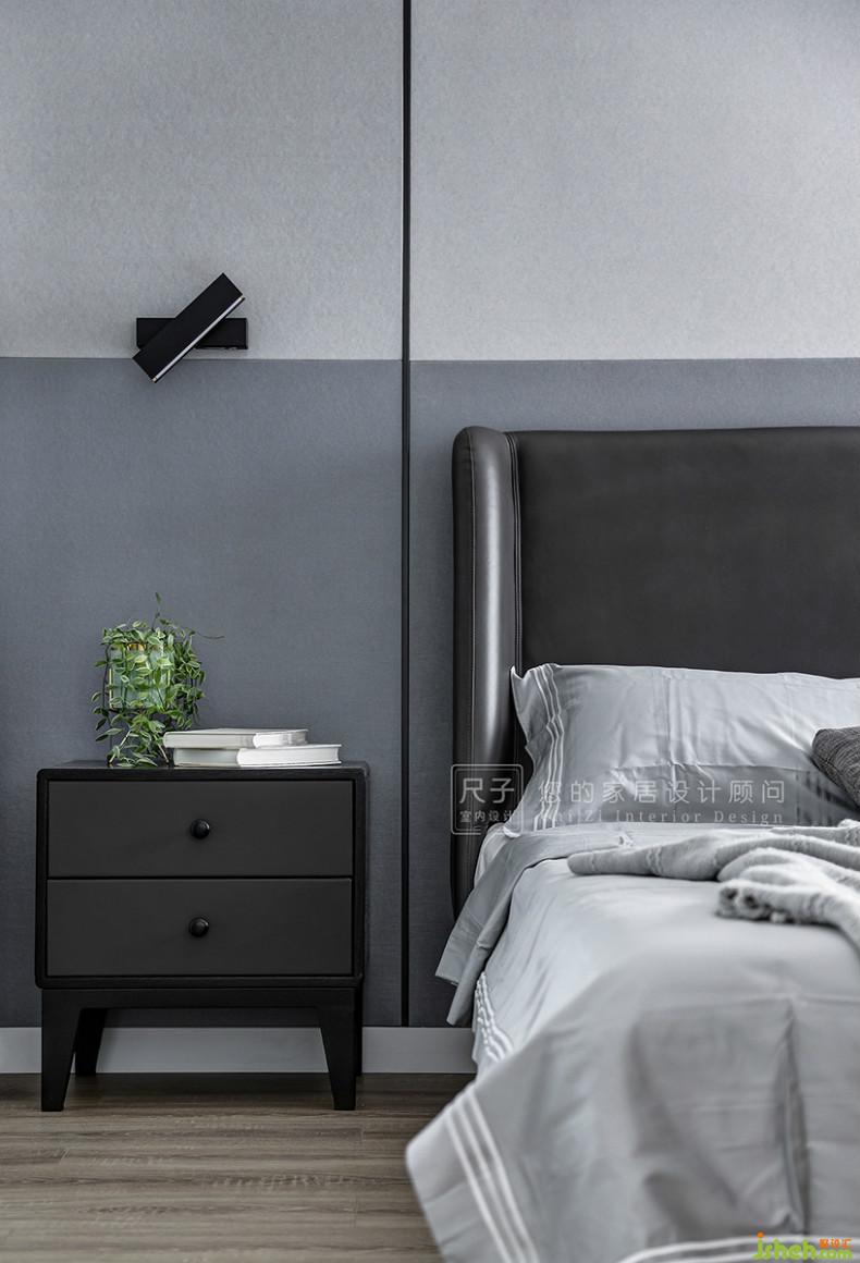 灰色硬包床头背景彰显着空间的品质感,不同明度的分色设计点缀出空间层次。