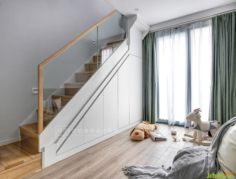 楼梯下的空间当然也不能浪费,根据楼梯的层层递进,其下方空间和定制的储物柜相结合,将杂物统统收纳其中;无拉手的柜子和楼梯融为一体,为视觉带来一片清爽。