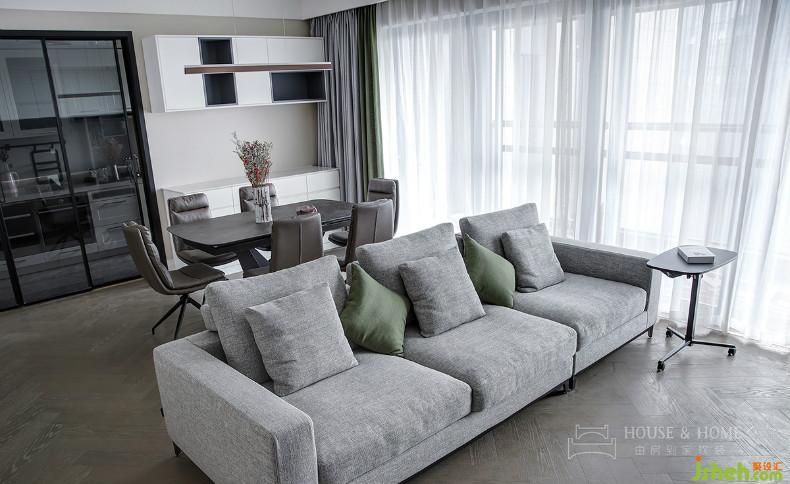 在高级灰的空间中,点缀富有生机的浅绿色窗帘、抱枕,以及质感非常的灰棕调家具。当光线照进屋内的那一刻,温暖、舒适与沉静,在内心充盈。