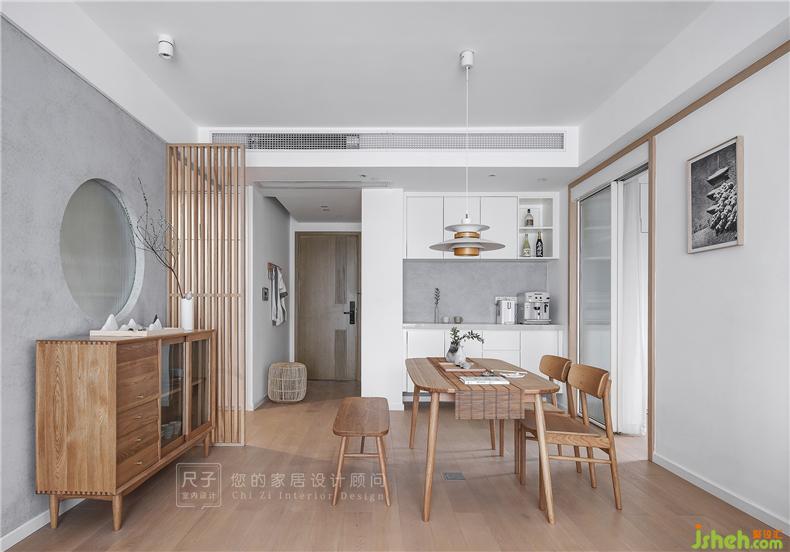 圆形造型端景,除了在功能上在可以将光线引入公卫以及厨房,加强空间联动性外,更强调一种空灵、静谧的居住禅意。室内设计师