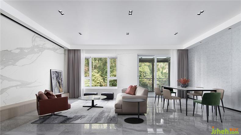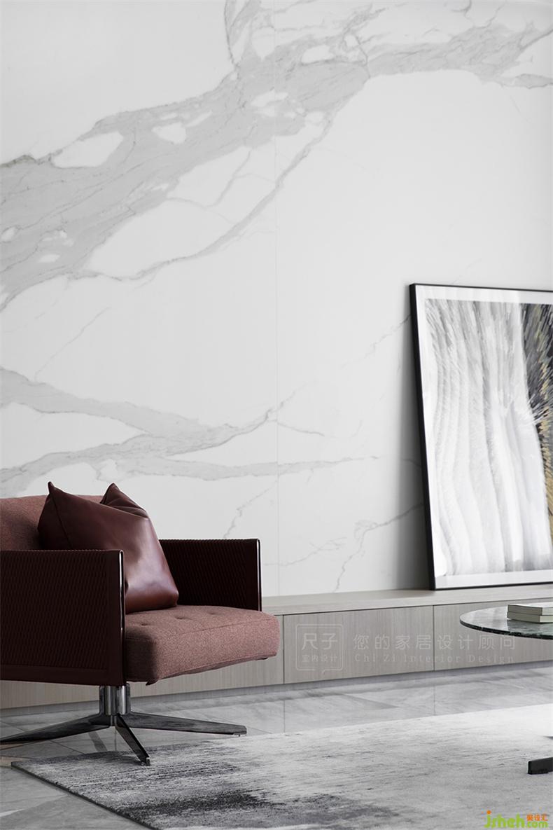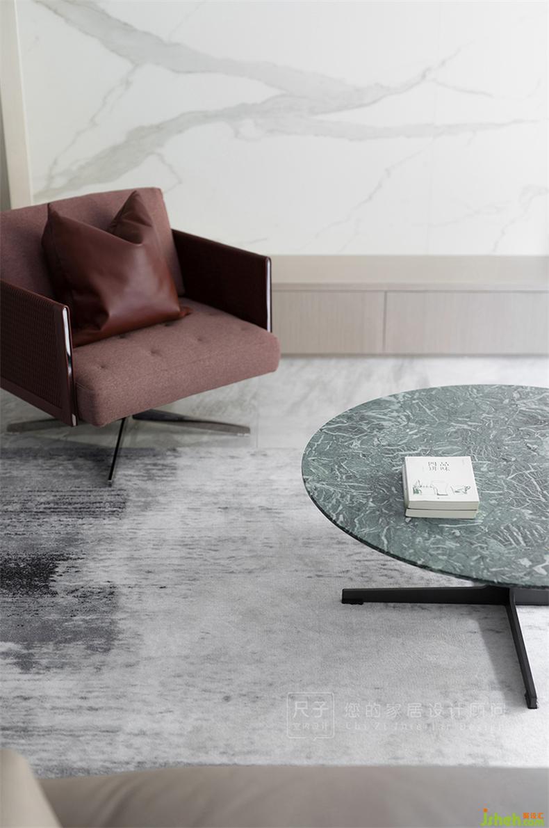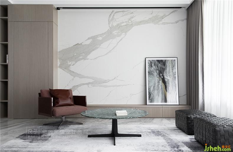 大理石纹的茶几与地面呼应,皮布沙发造型各异,却都保持简约,色彩上也多给人温润、舒适的居家温馨感。