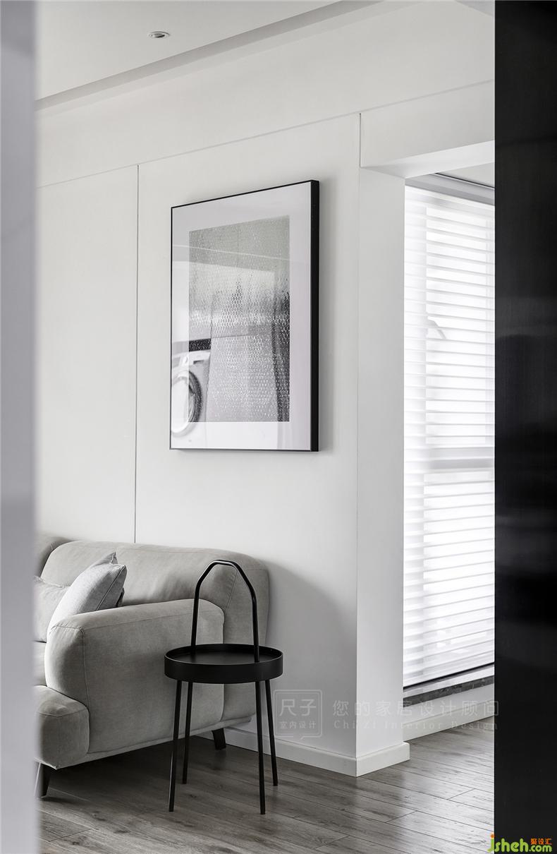 装饰画中零星散落的蓝,是严谨中的一抹清透,穿破了冷静的空间氛围。室内设计师