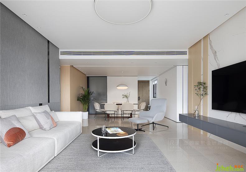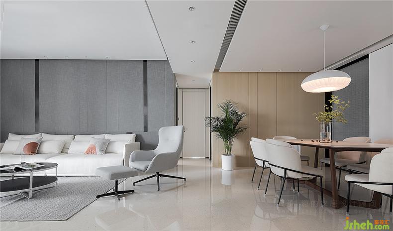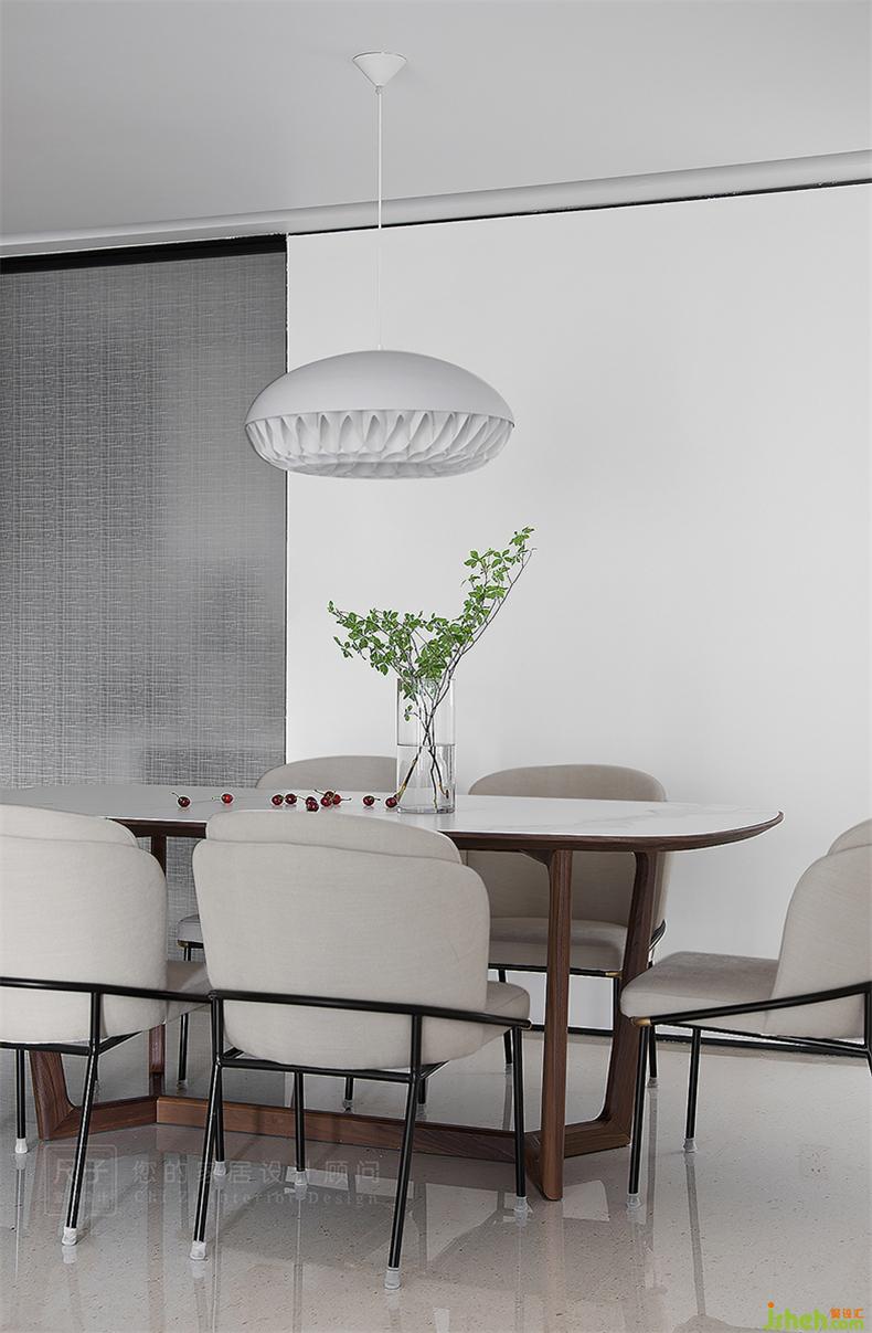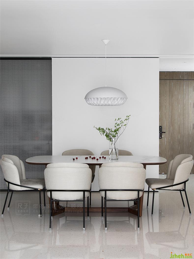 造型材质的统一,让客厅餐厅形成隐秘的关联。室内设计师