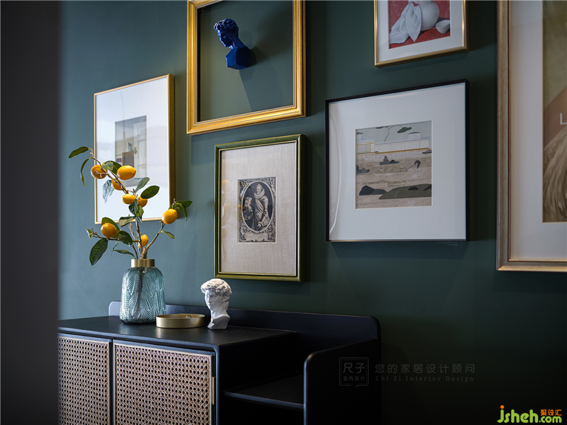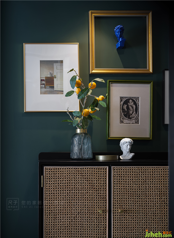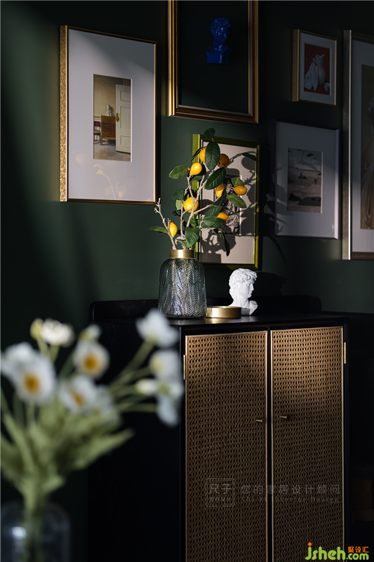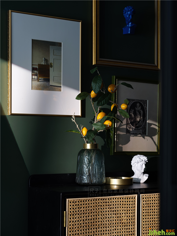 玄关处的暖色灯光为家居配饰打造出一个独特的舞台,松绿花瓶与柠檬果静立在藤编鞋柜上,与不同色彩的挂画组合,演绎一场万种风情的戏曲。