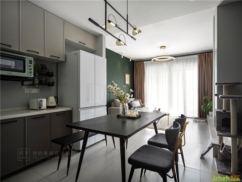 黑金配色的餐桌椅搭配着同色系后现代极简个性吊灯,从橄榄绿玄关开启的复古之旅,在餐厅空间得以延续变化。