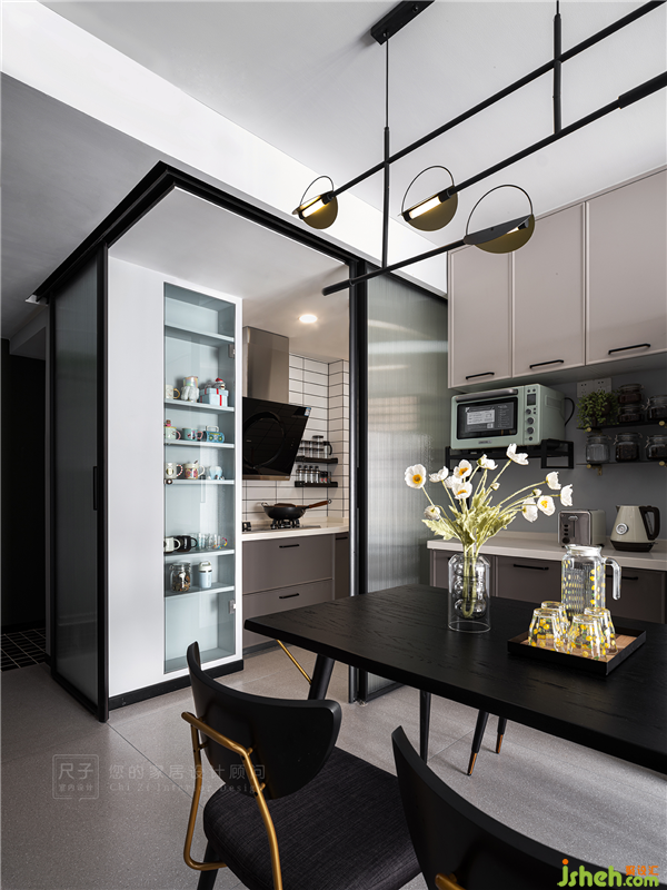 黑框玻璃推拉门不仅颜值在线,也能充当着实用的空间隔断,清晰界定出餐厨两个功能区;玻璃材质特有的通透感,却也为两个空间建立了亲密的联系。