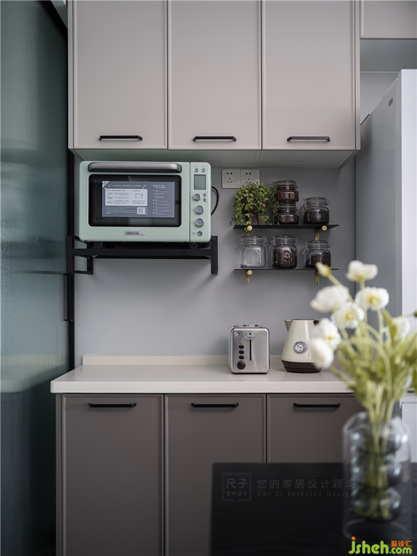 暖灰色餐边柜上,薄荷绿电烤箱把空间从深色复古调拉入清新自然的现代风世界,隔板上的瓶瓶罐罐,带着真实温暖的烟火气。