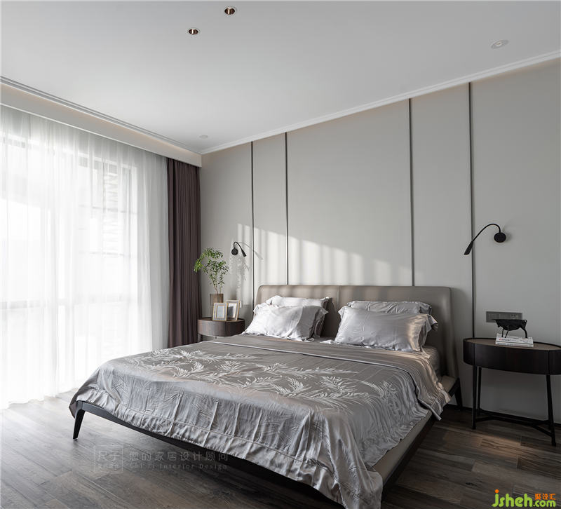 主卧简约而温柔。白色床头墙,暖木色地板,两侧对称的床头柜与壁灯,现代优雅的皮艺床铺,呈现出轻松舒适的睡眠区。极少的色彩装饰下,只是简洁的白色和木色却给我们一种舒缓与自然的纯净感。