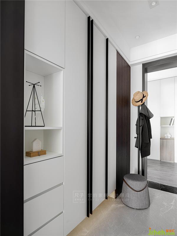 为了实现玄关处的收纳需求,我们将正对门的这面墙后移,利用与承重墙之间的凹位做了柜子。