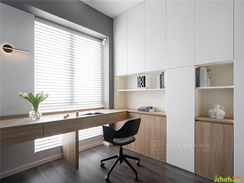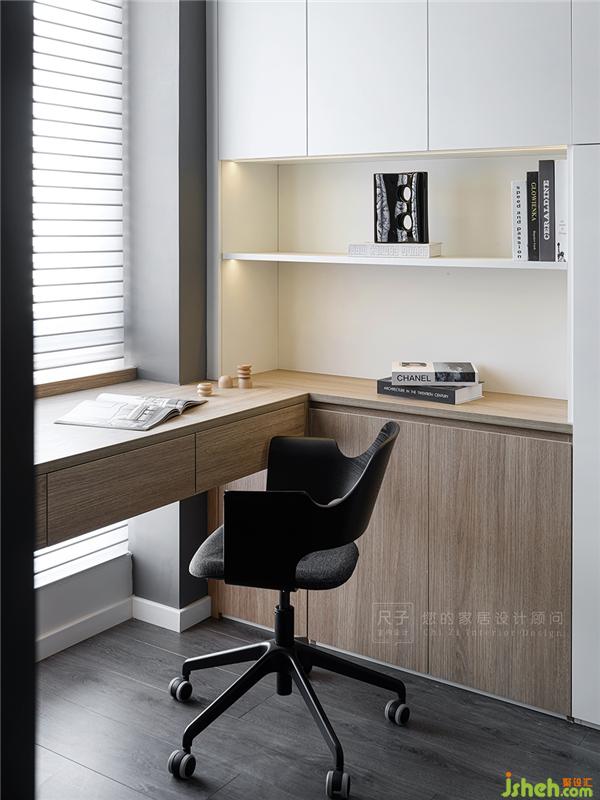 与书柜一体的书桌横跨落地窗,让夫妻俩能够同桌工作学习。