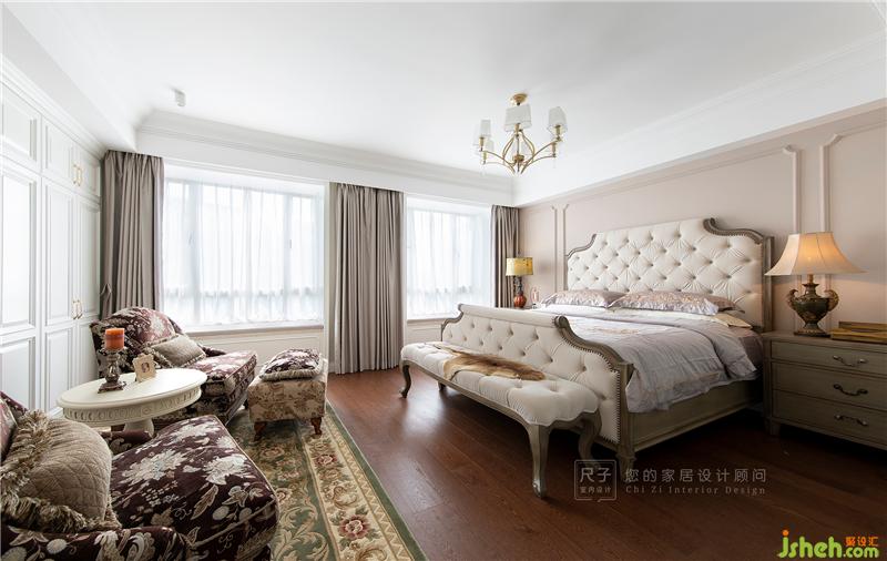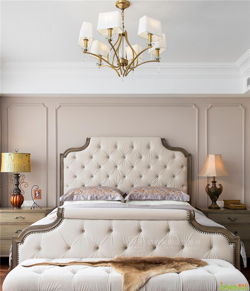 温暖的米咖色配色,以及极具美式线条感的床具,搭配花色地毯、沙发,沉稳中又不乏活力,给人一种张弛有度的休闲感。