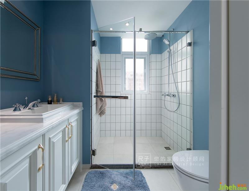 套间内的洗漱空间是清新时尚的蓝白配色,干净、明朗,足以洗去一天的疲累。