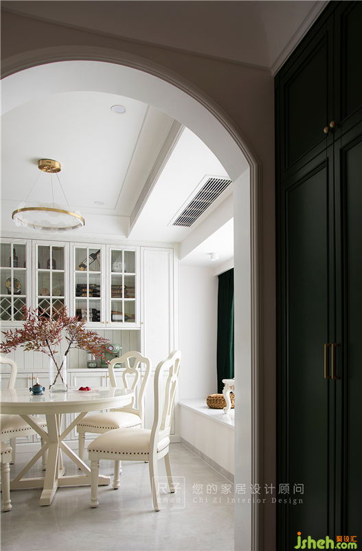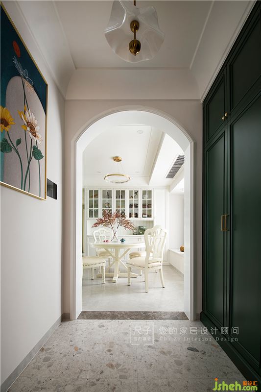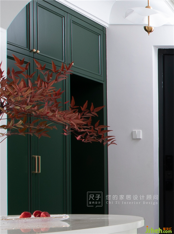 从室外迈入,浓重的墨绿色柜门自带优雅复古的气质,造型门洞恰到好处地增加了线条的柔和感。