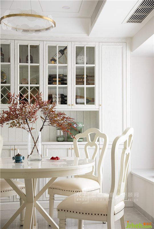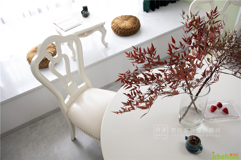 穿过门洞,是精致实用的用餐区,大面飘窗为屋内引入充足的自然光线,在白色木质桌椅的映衬下,空间显得更为明亮通透。