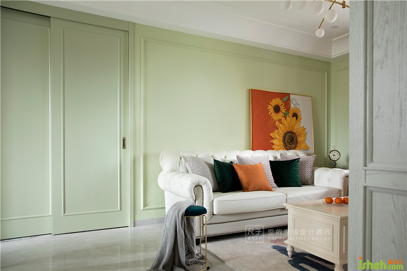 清透的绿色调游弋在客餐空间,搭配向日葵装饰画,对比强烈,大胆的配色让室内空间焕发节奏与活力。