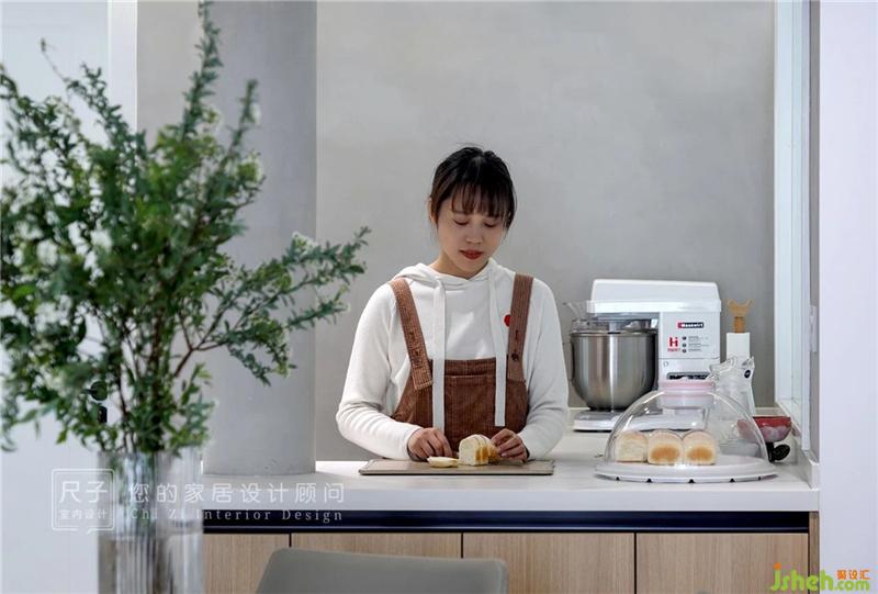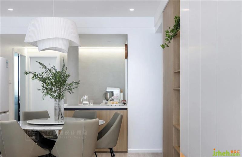 餐厅区域有一方不可改动的承重柱,尺子室内设计以艺术涂料装饰,巧妙地与西厨区墙面相呼应;环绕承重柱做的半高吧台,也恰好让两个功能区有了隐隐的分割。