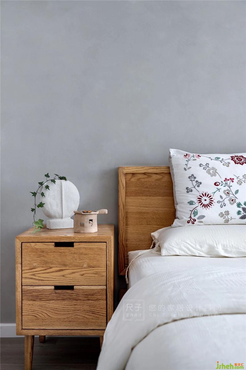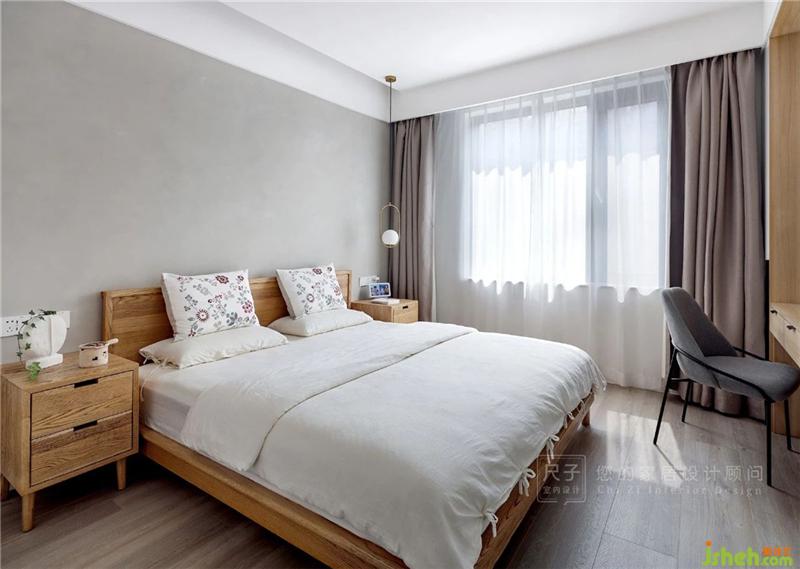 灰白木三色交织,百搭的色彩奠定卧室温润宁静的氛围。床尾的一排储物柜与梳妆台结合,满足了男女主人的实用性需求。