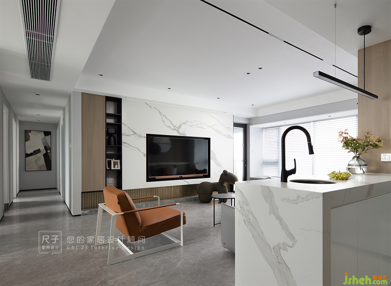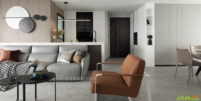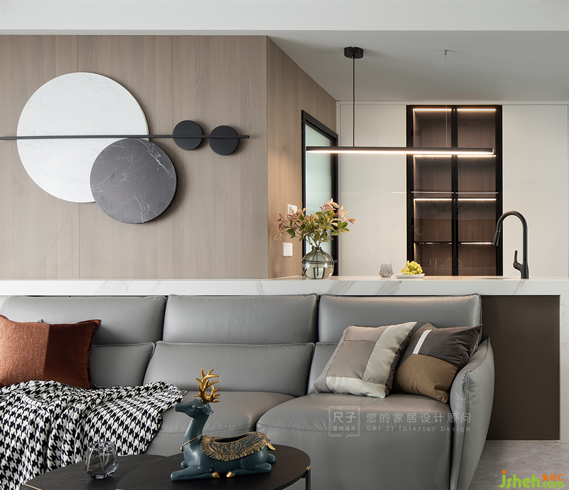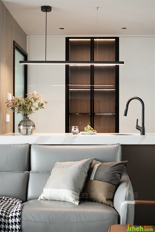 吧台与沙发相连,成为两个功能区之间的分割线,客厅与西厨区界限分明又彼此衔接。