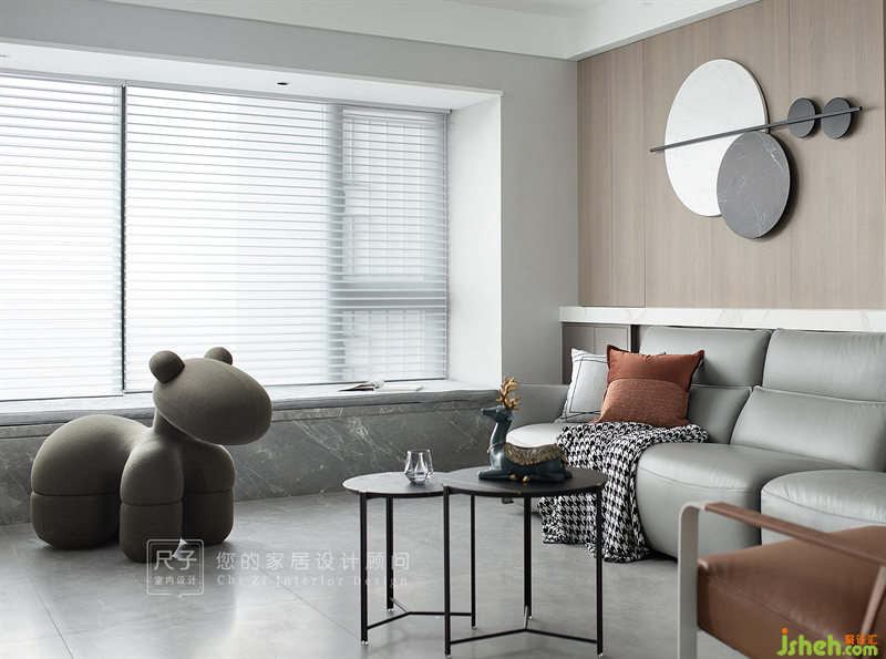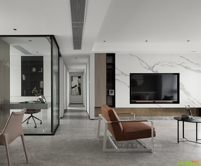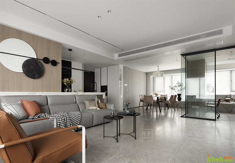 进门后,通透的公共空间映入眼帘,黑白灰的沉稳基调下,木色、咖色的融入更贴合自然。