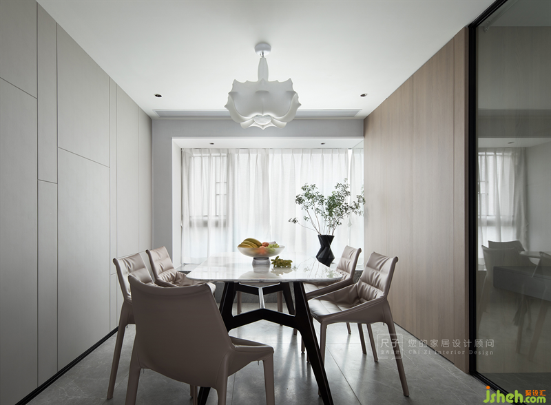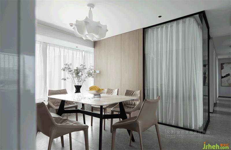 餐厅开间不大,我们选择拆除了餐厅与相邻的书房的半堵墙,饰以玻璃隔断,巧妙地利用材质的通透感来达到放大空间的效果。