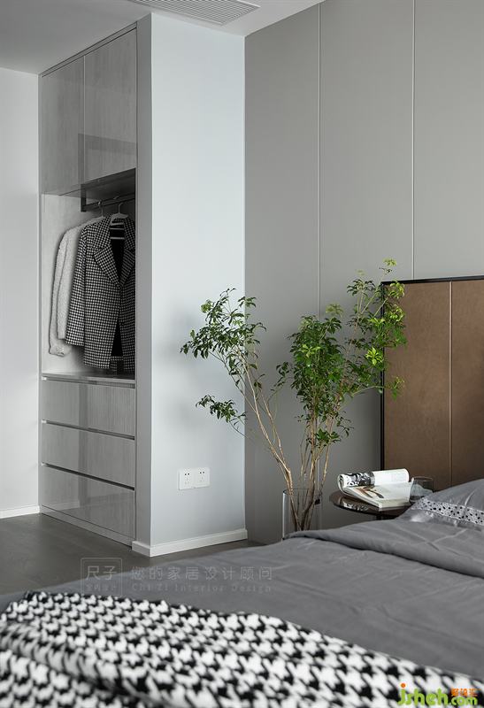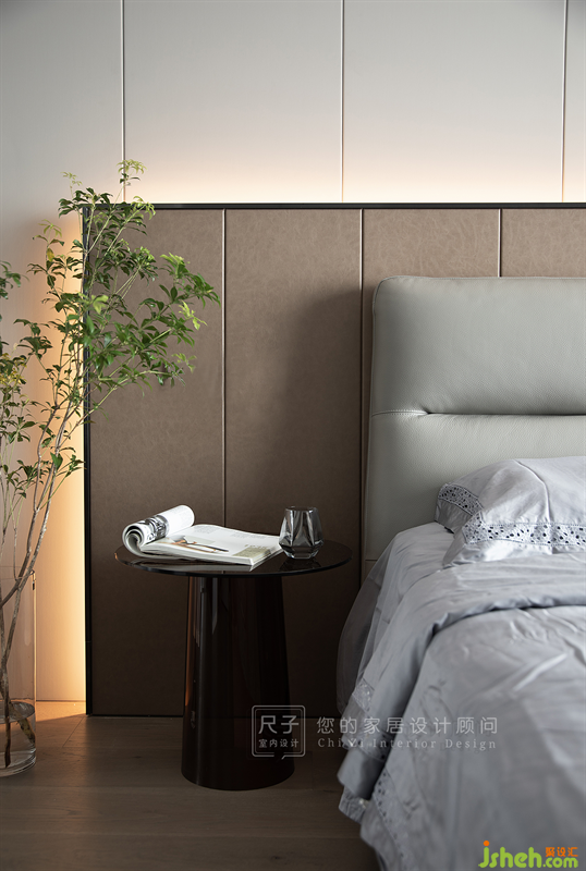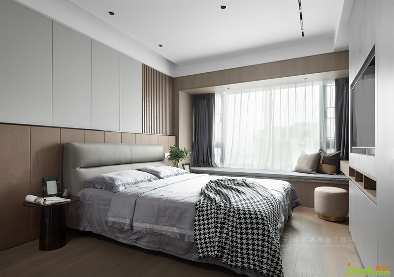床尾增加了一排储物空间,内嵌电视,满足了男女主人睡前观影的需求。