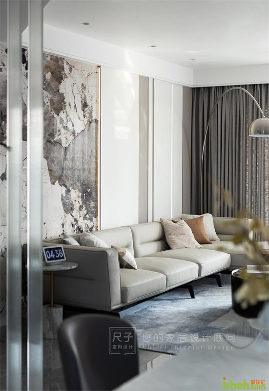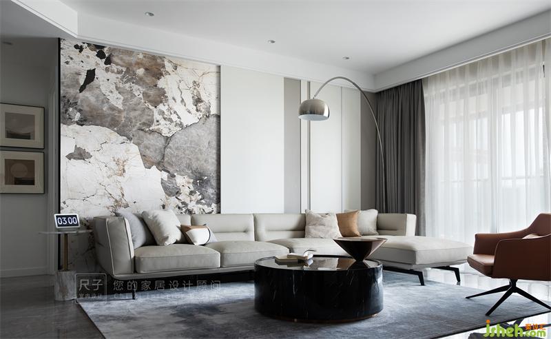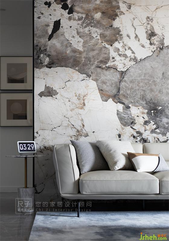 岩板背景墙结合高低错落、灰白相间的背板,材质的碰撞与层次感的处理,成为客厅里一道亮眼的风景线。