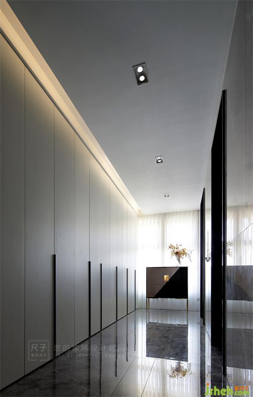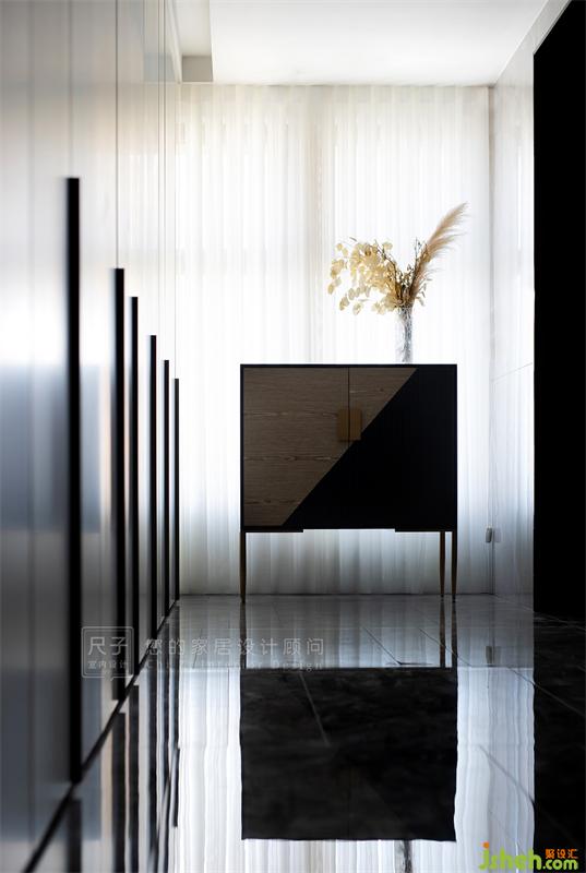 端景柜在光影的装饰下,呈现深邃迷人的魅力,而最令人惊叹的是一整排储物柜,满足一家人的居住收纳需求。