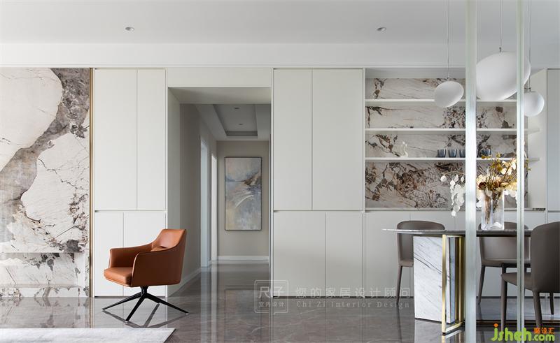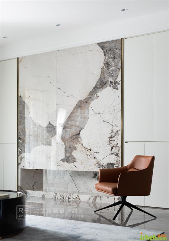 屋主夫妻俩希望家在浅色调的基础上,保持质感与层次;设计师以岩板材质的特性贯穿全屋设计,复刻大自然石材逼真的纹理、色彩和质感,打造雅致轻奢的空间美学。