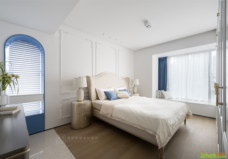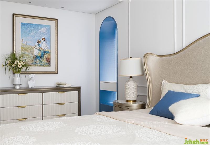 进入主卧,闯入眼帘的是蓝色护墙板包裹住的拱形窗洞,墙面的雕花线条使空间基底更为优雅。