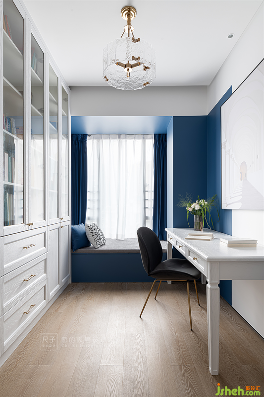 另一间书房与主卧相邻,定制的双人书桌让夫妻俩可以一同办公、阅读,大面积的书柜也能满足这个家的藏书需求。