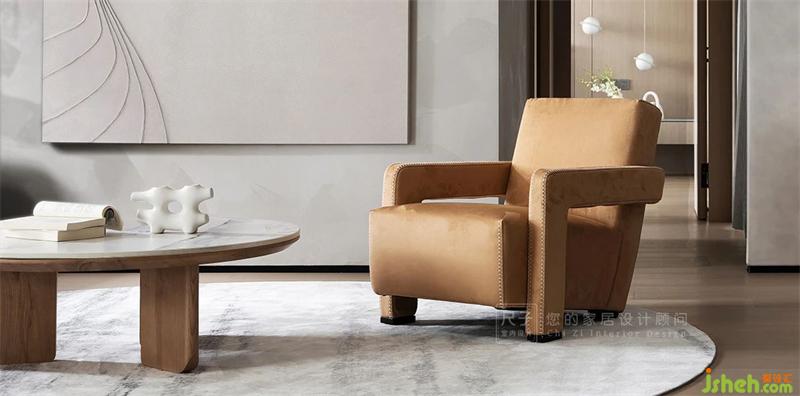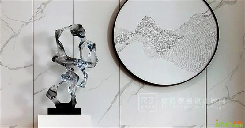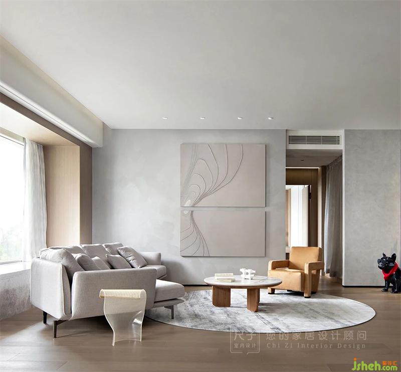 墙面装饰画,不规则的线条无限绵延,将视线牵引至地面,圆形的地毯与茶几,一大一小相映成趣。